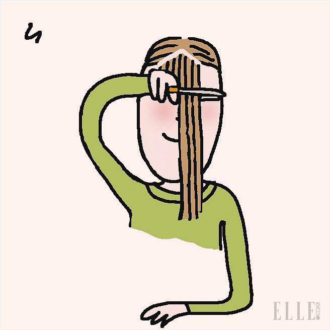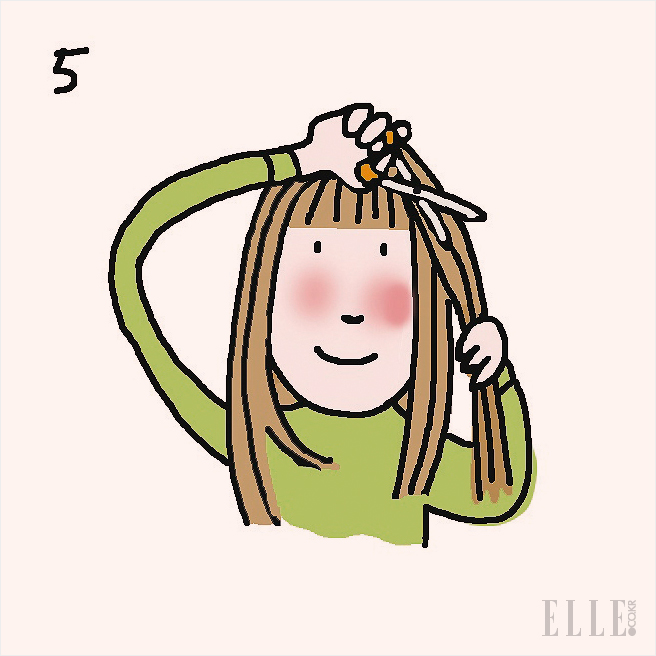 일자 가위를 옆으로 조금씩 (약 1cm씩) 이동하면서 앞머리를 자른다. 이때 손가락 사이에 머리카락을 넣고 자르지 말 것. 그래야 앞머리가 삐뚤빼뚤 잘라지지 않는다.