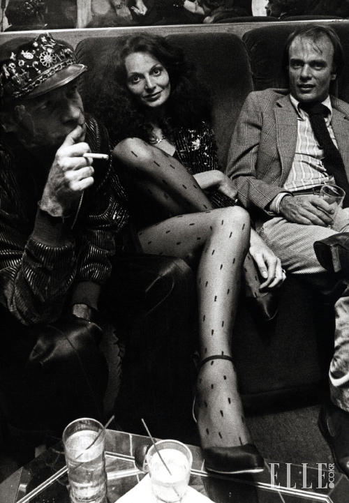 파티에서 저런 포즈와 눈빛으로 무심하게 아주 살짝 미소만 머금은 여인이 앉아 있는데 빠져들지 않을 남자가 과연 누가 있을까? 섹시한 스타킹에 아찔한 앵클 스트랩 힐, 그리고 그녀의 시그너처인 랩드레스를 입고 소파에 깊숙이 눌러 앉아 파티에 참석한 친구들이 즐기는 모습을 물끄러미 바라보고 있는 다이앤 본 퍼스텐버그. 여자라면 꼭 한 번 따라 해보고 싶을 만큼 매혹적인 포즈로 전설적인 패션 신을 연출한 그녀가 있는 이곳은 전 남편이었던 에곤 본 퍼스텐버그(오른쪽)의 책