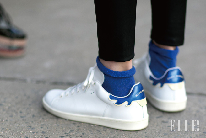 스니커즈 뒤꿈치의 포인트와 컬러를 맞춘 삭스 스타일링으로 뒷모습에 시선을 한층 집중시킬 것.
