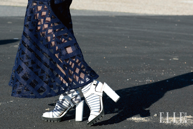 아저씨들의 전유물로 여겨졌던 샌들과 양말의 조합은 더 이상 패션 테러가 아니다. 화이트 샌들에 매치한 스트라이프 삭스가 허전한 발등을 채워준다.
