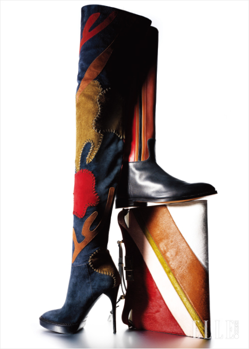 사이하이 부츠는 3백10만원, Burberry. 라이딩 부츠는 가격 미정, Hermes. 구성주의적 패턴의 피카부 클러치백은 5백6만원, Fendi.