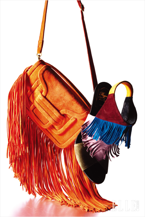 시선을 사로잡는 오렌지 컬러의 프린지 백은 1백49만원, Pierre Hardy. 컬러 블록으로 더욱 다채로워진 프린지 슈즈는 1백30만원대, Roger Vivier.