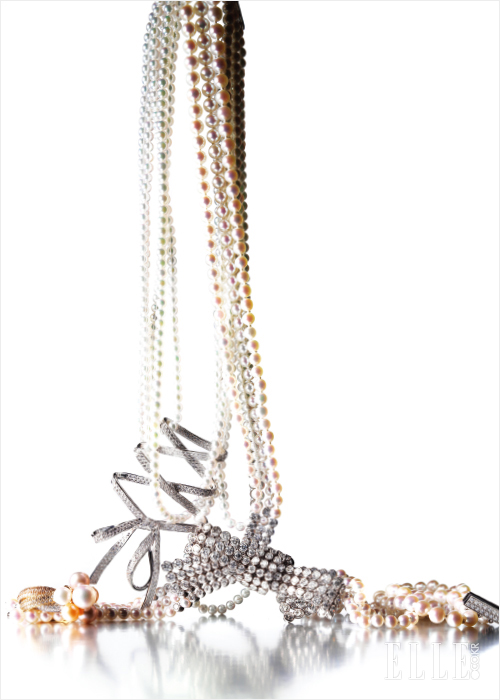 코르셋 모티프의 오퓰런스 네크리스는 5천5백만원대, Tasaki. 트리니티 진주 링은 4천5백만원대, Cartier. 루반 마드모아젤 펄 네크리스는 가격 미정, Chanel Fine Jewelry.