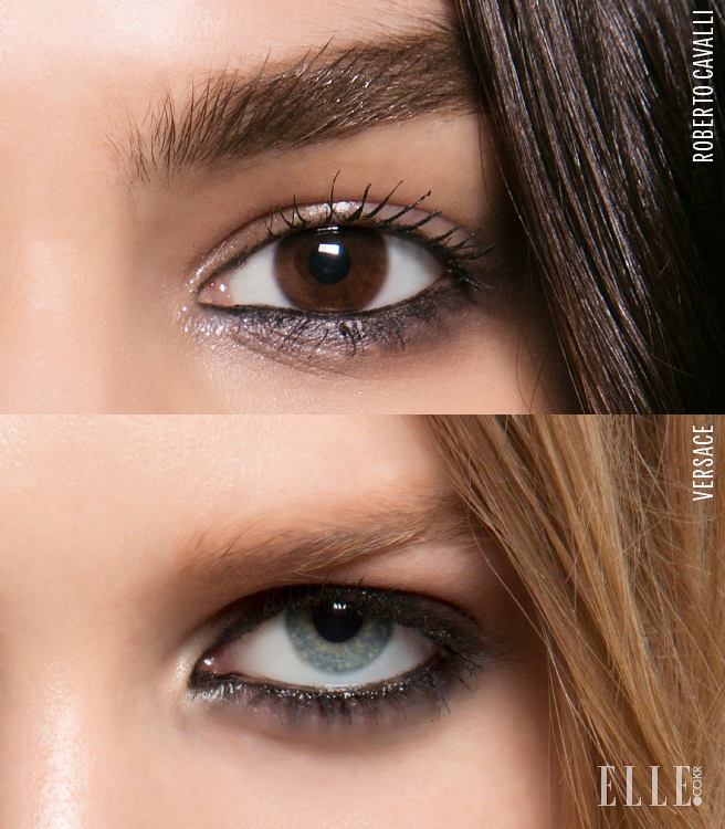 A 점막을 블랙으로 그리면 눈매가 또렷해지긴 하지만 커 보이는 건 아니에요. 아래 움직이는 사진을 보세요. 포토샵으로 언더라인 점막을 채워봤는데 어떤가요? 눈매가 또렷해지긴 해도 눈이 더 커 보이진 않죠? 언더 점막을 블랙으로 그리는 동시에 눈이 커 보이는 게 목적이라면 점막을 메운 후 블랙이나 그레이, 브라운 컬러의 아이섀도로 이를 자연스럽게 연결해 음영을 주세요. 스모키 아이를 연출한 베르사체나 로베르토 카발리처럼요! 개인적으로는 블랙보다 화이트 펄이나 샴페인 골드 컬러의 펜슬로 언더라인 점막을 채워 눈매를 트여 보이게 만드는 걸 선호한답니다. 아직도 해보지 않으셨으면 꼭 한번 시도해보세요!