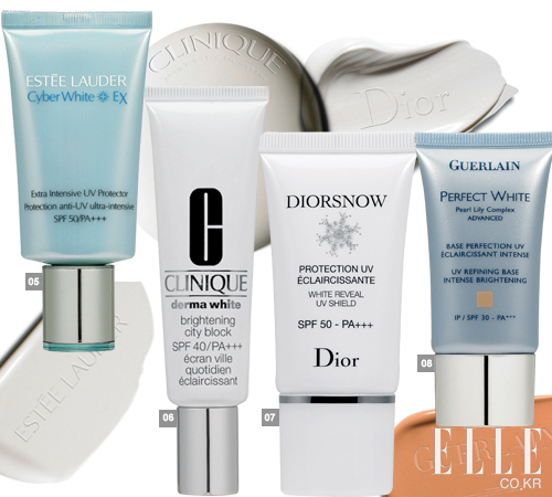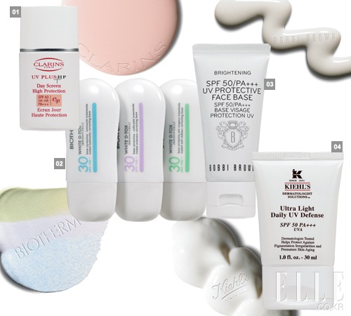 1 UV PLUS 데이 스크린 SPF 40 PA+++ 59,000원100% 실리콤 성분 텍스처가 피부에 파우더리한 보호막 형성, 30ml. 2 화이트 디톡스 [브라이트 ? 셀] 메이크업 베이스 SPF 30 PA++ 48,000원피부톤을 즉각적으로 보정하고 색소 침착을 방지, 30ml. 3 프로텍티브 페이스 베이스 SPF 50 PA+++ 68,000원메이크업 위에 덧바를 수 있도록 특수 고안된 수분 가득한 포뮬러, 50ml. 4 울트라 라이트 데일리 UV 디펜스 SPF 50 PA+++ 워터 베이스 45,000원포뮬러가 하루종일 피부를 촉촉하게 유지해줌, 30ml. 5 퍼펙트 화이트 UV 리파이닝 베이스 SPF 30 PA +++ 34,000원섬세한 베이지 컬러가 결점을 보완하고 피부톤을 고르게 함, 30ml.