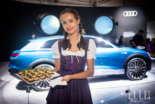 아우디 부스에서 나눈 아침식사 중 하얀 소시지의 고장인 바이에른 전통 의상을 입은 여성이 등장했다.