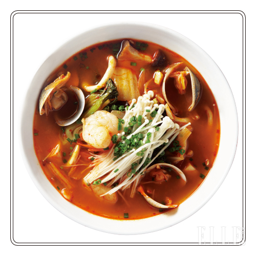 호텔 내 레스토랑 ‘키친’에서 요리해 바로 서비스하는 해물짬뽕. ‘홈 어웨이 프롬 홈(Home away from Home)’을 컨셉트로 편안하고 가정적인 퀴진을 표방하는 레스토랑의 음식답게 푸짐함이 남다르다. 국물에 시원한 맛을 더하는 해물은 넉넉해서 젓가락에 차이고, 면발은 우동 면에 가깝게 통통하다. 맵거나 짠 강한 맛 대신 해산물과 면발의 쫄깃하고 탱탱한 식감이 미각을 마구 자극한다.