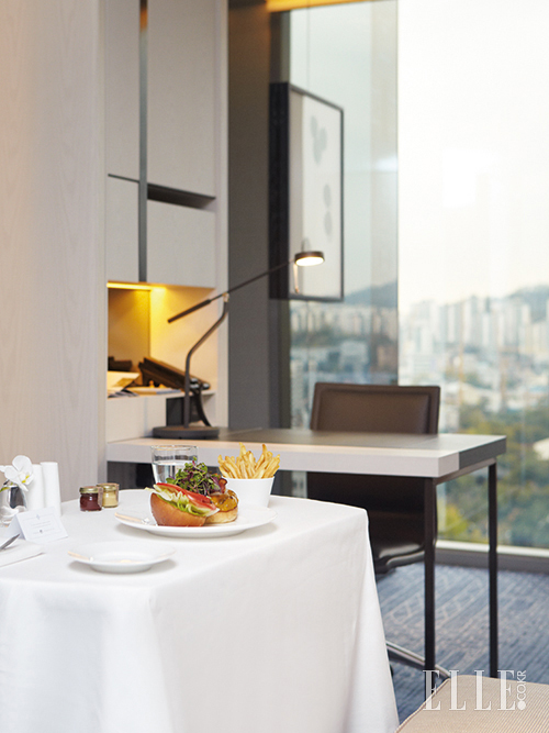 서울 시내 럭셔리 호텔의 흐름에 방점을 찍은 포시즌스 호텔이 추천하는 인 룸 다이닝 메뉴는 햄버거. 아이패드를 통해 빵에 참깨를 뿌려달라는 세세한 요구사항도 ‘터치’ 한 번으로 주문할 수 있다. 서비스는 아날로그의 따뜻함 그대로, 펼치면 테이블이 되는 트롤리 위에 햄버거, 포크와 나이프를 정갈히 놓아주는데, 우아하게 썰어서 한입 살포시 넣었다가도 두 손으로 들고 덥썩 베어 물고 싶어지는 패티의 불 맛이 화룡정점이다.