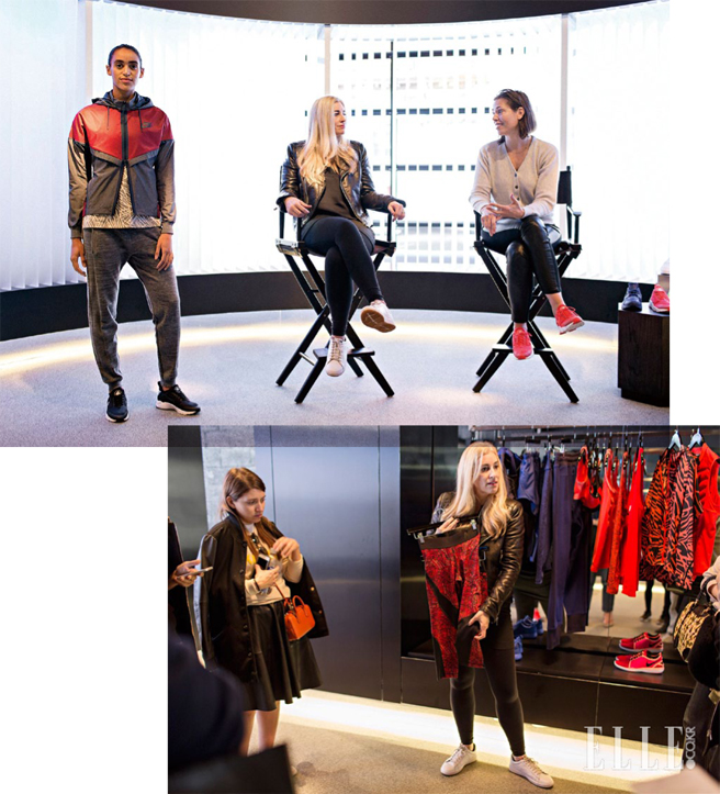 올봄 출시할 나이키 스포츠 웨어 재킷에 대해 설명 중인 헬렌 부쉐와 줄리 이가라시.