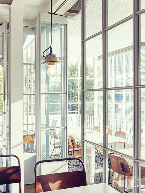 삼청동 입구에 있는 카페 D55의 매력은 인더스트리얼의 거친 인테리어를 따뜻하게 풀어낸 데 있다. 공간의 투박한 느낌을 없앤 건 모던한 디자인의 가구와 미니멀한 무드의 소품들이다. 디자인은 절제하는 대신 완성도는 높인 소품들을 곳곳에 적절하게 배치했다. 의도적으로 노출한 콘크리트 천장과 바닥을 제외하고는 화이트 컬러로 벽을 칠하고, 선이 가는 철제 가구와 밝은 톤의 원목 가구들로 내부를 채우니, 절로 모던함과 빈티지함이 어우러진 분위기가 만들어졌다. 2층에서 가장 매력적인 공간은 사방이 통창으로 둘러싸여 환한 빛이 쏟아지는 테라스 좌석이다. 볕 좋은 날에는 고즈넉한 서촌의 풍경을 마음껏 담을 수 있는 외부 좌석도 인기가 좋다. 비슷한 듯 다른 디자인의 테이블과 의자 덕분에 공간이 지루하지 않고, 자꾸만 여기저기 둘러보고 싶다. 인더스트리얼 가구 브랜드 디인더스트리(d’INDUSTRY)의 쇼룸 겸 카페인 이곳은 일본식 가옥을 개조해 만들었는데 접시와 그릇 같은 식기류는 물론이고 문고리와 옷걸이, 향초, 손잡이 같은 소소한 소품까지 모두 취향이 듬뿍 담긴 아이템들이다.