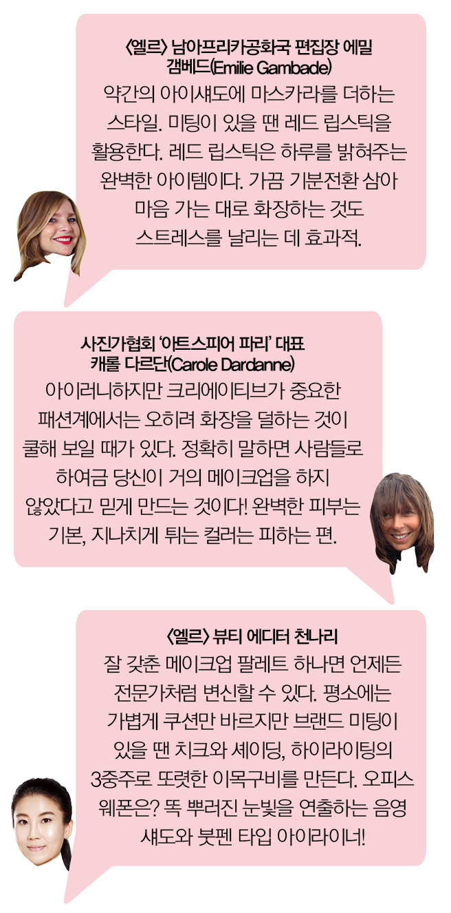 워킹 걸은 파티 걸이 아니다. 짙은 스모키 아이나 번쩍번쩍한 글리터 룩은 피해야 한다는 얘기. 아이돌 가수처럼 꾸밀 필요는 없지만 낮 시간에 메이크업을 살짝 수정하는 것만으로도 생기를 되찾고 야무진 인상을 만들 수 있다. 메이크업 아티스트 배혜랑은 사무실 필수품을 꼽아 달라는 질문에 의외로 면봉을 꼽았다. “번진 아이 메이크업이나 립 라인만큼 언프로페셔널해 보이는 경우도 없죠. 이를 수정하거나 아이라인을 날렵하게 뺄 때 면봉만 한 소품이 없어요.” 쿠션이나 립 컬러 같은 기본적인 메이크업 아이템은 파우치에 갖고 다니니 따로 준비할 필요가 있겠느냐는 말과 더불어! 그렇다면 진짜 오피스 우먼들은 무엇을 어떻게 바르는지 그녀들의 노하우를 들어보자.