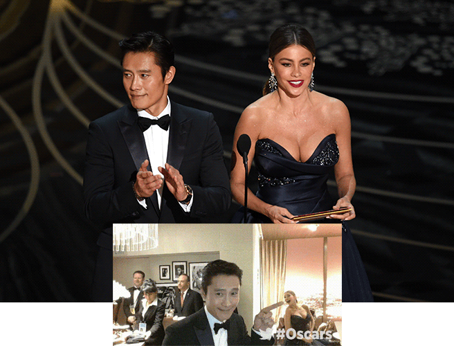 아카데미 시상식 개최 후 88년 역사상 처음으로 무대에 선 한국인 배우는, 대체할 수 없는 연기의 소유자 이병헌입니다. 백스테이지에서의 여유로운 눈웃음 좀 보세요. 정말 오스카 첫 시상 경험 맞아요?
