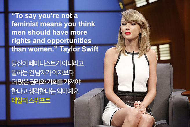 어린 팬들이 따라 할까 봐 담배, 마약, 문신은 절대 하지 않는다는 뮤지션 테일러 스위프트는 페미니즘에 대해 일찌감치 이렇게 말했죠. “평등의 다른 이름이죠.”