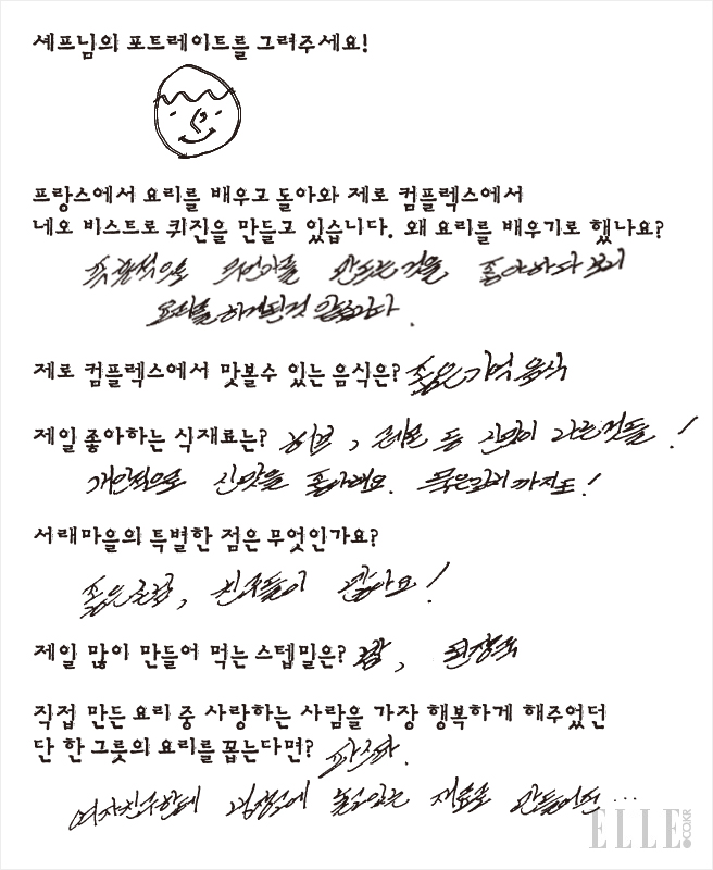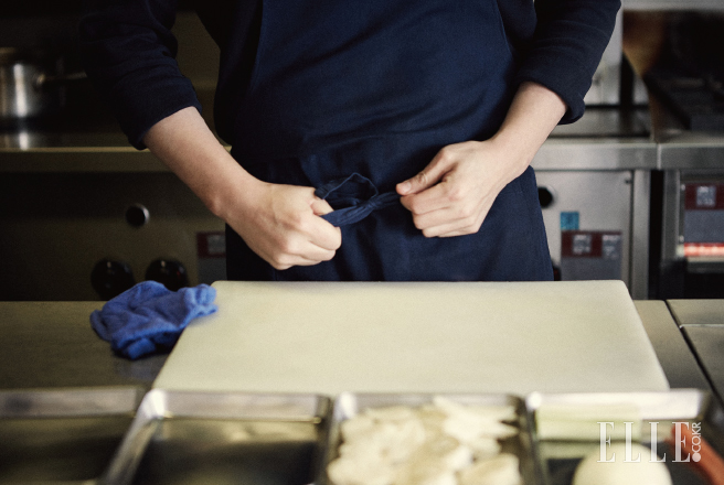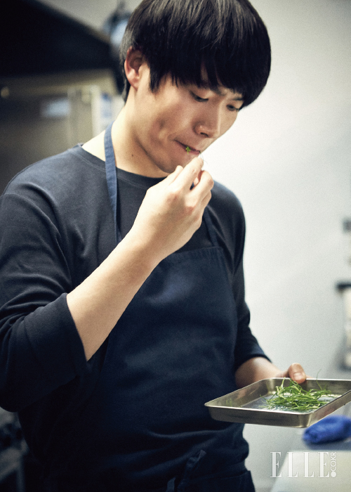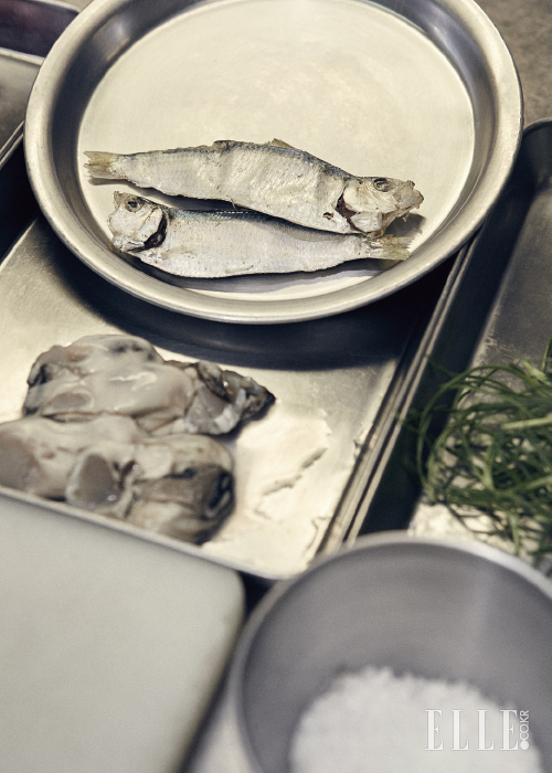 이충후 셰프가 선보이는 네오 비스트로는 이색적인 식재료를 조합해 신선한 재료 본연의 맛이 살아나도록 간결하게 조리한 프랑스 요리다. 식재료에 대한 그의 사랑은 특별하지만, 대단한 비법이 있는 건 아니란다. 그저 새로운 것들을 새롭게 조합해 보는 것. 그만큼 어깨에 힘을 빼고 여러 가지 시도를 해 본다. 그러나 결과물은? 신통할 정도로 잘 어울린다. 그 독특한 창의력이 어디서 왔는지를 묻자 예상치 않게 ‘기억’이라는 단어가 나온다. “프랑스에서 먹어보고 요리해 본 맛들을 제 기준에서 재해석하는 거죠.” 우리 기준에서는 생경하지만 한국에서 구할 수 있는 재료를 더했을 뿐, 천지개벽할 정도의 새로운 퀴진은 아니라는 것. 한국에 많이 소개되지 않은 음식 트렌드를 구현한다는 점에서 그는 꽤 선구적이다. 소울푸드로 떡국을 만들 때도 뚝딱뚝딱 자취생이 요리하듯 무심하게 끓이더니 마지막에 신선한 세발나물을 그릇 가득 올리니, 갑자기 봄 내음이 확 풍겨온다. “제로 컴플렉스에서 먹을 수 있는 음식은 아니지만, 그럼에도 저만의 개성은 나와야 하니까요. 후후.” 그의 덤덤한 대답이다. 음식을 닮은 그의 공간은 온전히 스테인리스스틸로 채워져 있고 별다른 장식도 없다. 게다가 목까지 깃을 빳빳이 세운 셰프 조리복이 아니라 네이비 컬러의 무지 티셔츠를 입고 있다. 앞치마는 안 입느냐고 물었더니, 티셔츠와 똑같은 네이비 컬러 앞치마를 두른다. 무덤덤하다 못해 투박할 정도. 어머님이 끓여준 떡국도 아무 말 없이 국물까지 비웠을 게 분명한 경상도 남자다.