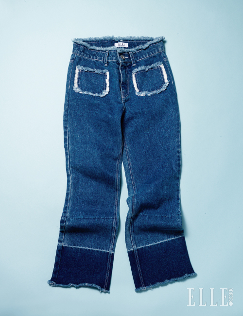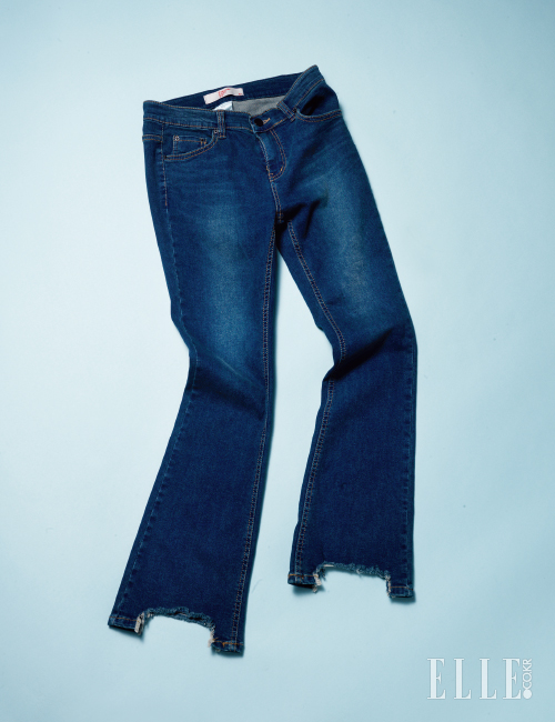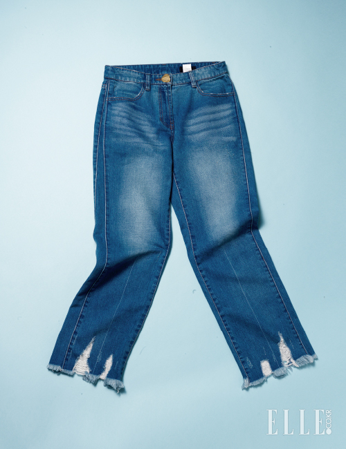 찢어지고 헤진(디스트로이드) 밑단 처리가 마치 레이스 같은 착시를 준 섬세한 데님 팬츠. 중앙에 주름처럼 워싱한 화이트 선이 날씬하고 길어 보이는 효과를 준다. 34만5천원, Time.