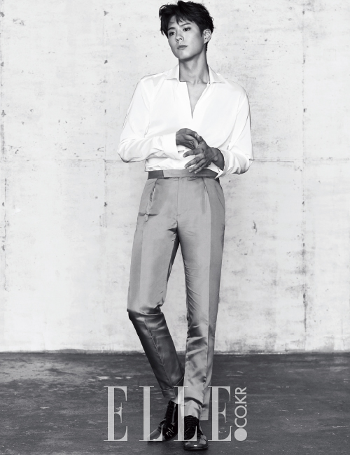 화이트 셔츠는 Monte Via. 그레이 팬츠는 Kimseoryong. 투톤 슈즈는 Burberry.