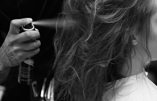 Step 1 볼륨을 살려주는 에센스를 모발 전체에 발라준다. 그 다음 헤어스프레이를 한 번 더 뿌려준 뒤, 빗으로 곱게 빗어 고데기를 대기 용이한 최적의 모발 상태를 만들어준다.