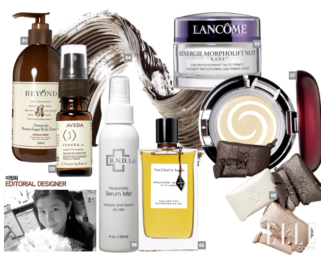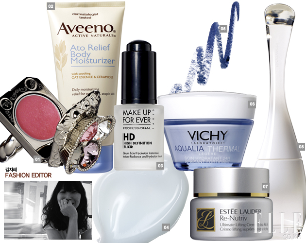 1 질 스튜어트 다이아몬드 듀 립 컬러 립글로스처럼 촉촉하고 컬러도 나쁘지 않다. 그런데 저 패키지는 진정 손가락에 끼고 사용하란 말입니까. 여섯 살 조카의 생일 날, “옜다!” 하고 던져 주련다. 가격 미정. 2 아비노 아토 릴리프 바디 모이스처라이저 장기간의 파리 출장. 유럽 특유의 석회물 때문에 피부가 버석거릴 때 즈음, 어깨부터 발끝까지 꼼꼼하게 발랐다. 자극이 거의 없어 민감한 피부에 딱인 제품. 1만4천8백원. 3 메이크업 포에버 하이 데피니션 엘리시르 피지 분비가 왕성한 피부에 썼다가는 늦은 오후가 되면 촉촉한 건지 번들거리는 건지 헷갈리기 십상. 지성 피부보다는 건성 피부에 적합할 듯. 4만8천원. 4 라네즈 워터 슬리핑 팩_EX 보통 잠자기 전에 크림을 바르거나 팩을 하면 끈적거리는 탓에 좀 찝찝한테 이 제품은 알코올 프리여서 끈적임이 덜해 좋았다. 2만5천원대. 5 매이블린 2 in 1 임팩트 섀도우 라이너 ‘오션 블루’ 평소 아이 메이크업을 하는 편이 아니라 아이라이너 그리기가 서툰 편인데 섀도처럼 부드럽게 발리는 탓에 쉽고 빠르게 아이라인을 그릴 수 있었다. 워터프루프의 크리미한 텍스처라 번지지 않고 오랫동안 지속된다. 9천원. 6 비쉬 아쿠알리아 떼르말 수분 영양 크림 수분 크림보다는 쫀득하고 일반 크림보다는 산뜻하다. 단, 완전히 흡수되는 데 약간의 시간이 걸리기 때문에 자외선 차단제를 바로 덧발랐다가는 밀려나는 잔여물을 목격하기 십상. 4만원대. 7 에스티 로더 리-뉴트리브 얼티미트 리프팅 크림 엑스트라 리치 이름에 ‘엑스트라’와 ‘리치’라는 무시무시한 단어가 붙어 있음에도 불구하고 이 제품은 부담스럽지 않았다. 오히려 야근으로 민감해진 피부를 편안하게 다스려주는 듯한 느낌. 38만원. 8 겐조 아무르 오드 투왈렛 플로랄 꽃향기를 맡으면 왠지 낯 뜨거워지는 이상한 체질을 가진 나. 그런데 과하고 자극적인 향이 아니라 은은하고 상쾌한 플로럴 향이 아닌가! 볕 좋은 날 살짝 뿌리고 산책 가고 싶어라. 40ml, 7만3천원. |