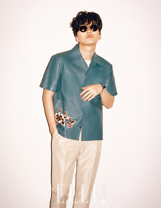 플라워 아플리케로 장식한 더스티 블루 컬러의 가죽 셔츠는 Valentino. 샌드 컬러의 실크 팬츠는 Kimseoryong. 화이트 셔츠는 Cheap Monday. 선글라스는 이동휘 소장품. 브레이슬렛은 에디터 소장품.