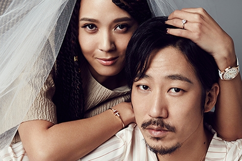 미래가 입은 원피스 Cos. 베일 The Queen Lounge. 왼손에는 티파니 세팅™ 링, 오른팔 브레이슬렛은 Tiffany T 다이아몬드 와이어 링, 18K 로즈골드에 다이아몬드가 세팅된 화이트 다이얼 화이트 악어가죽 스트랩 워치는 티파니 CT60™ 3핸드 34mm. JK가 입은 셔츠는 Kimseoryong Homme. 18K 로즈골드의 블랙 다이얼 블랙 악어가죽 스트랩 워치는 티파니 CT60™ 캘린더 40mm, 목걸이는 플로르 드 리스 키, 18K 로즈골드 체인,워치와 주얼리는 모두 Tiffany & Co.
