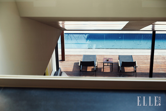 풀 하우스 침실에선 통창으로 수영장이 훤히 들여다보인다. 습기나 물 소리는 차단하고 시야는 탁 트이도록 했다.