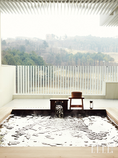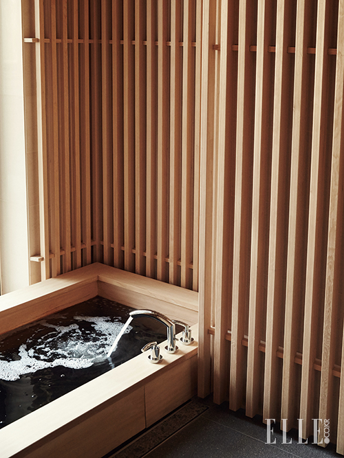 독채 형식의 더 하우스 내부에 있는 작은 히노키 욕조. 벽면까지 나무로 통일해 좁은 공간을 오히려 더 아늑하게 변신시켰다. 욕조 앞 통창을 열면 노천탕이 부럽지 않다.