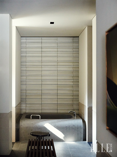 테라스 하우스의 욕실에는 거대한 스톤으로 우아하게 마감한 욕조가 시선을 단번에 사로잡는다. 표면을 둥글게 처리한 게 독특하다.