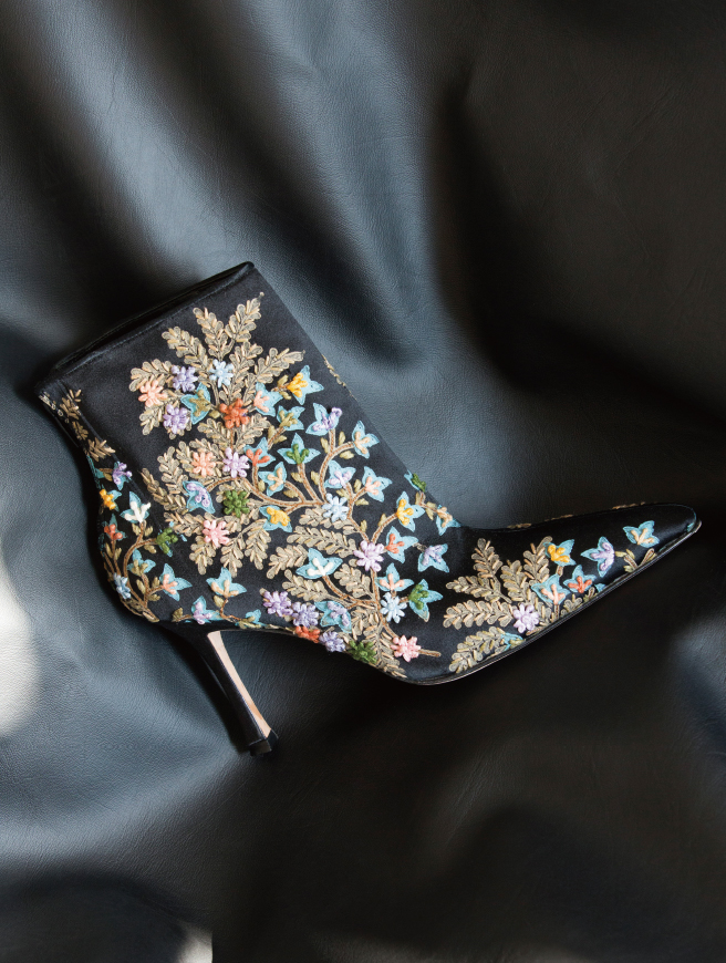 정교한 자수 장식이 더해진 마놀로 블라닉 아카이브의 스틸레토 힐 부티.