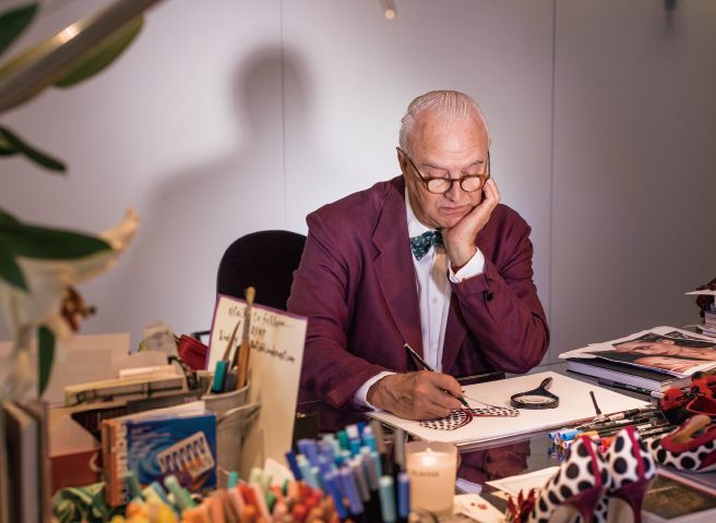 시그너처 아이템인 나비 넥타이를 매고 스케치 중인 마놀로 블라닉.