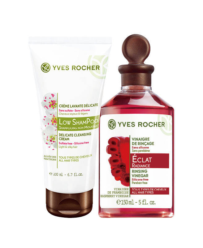 두피의 유수분 밸런스를 맞춰주는 라즈베리 린싱 비네거, 9천9백원, 자연 유래 성분 99%의 로우 샴푸, 8천5백원, 모두 Yves Rocher by Olive Young.