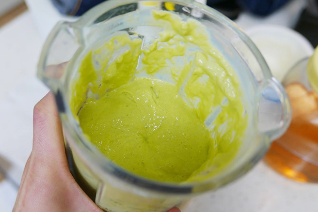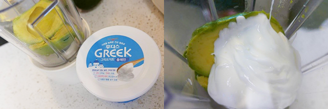 믹서기 안에 잘 다듬은 아보카도를 넣고