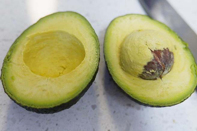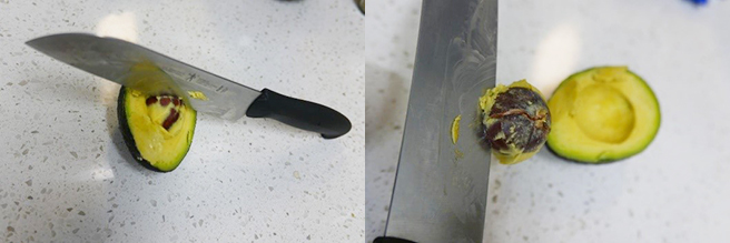 아보카도는 반드시 잘 익은 상태에서 먹어야 맛있는데요. 왼쪽이 아직 익기 전이고 오른쪽이 잘 익은 상태랍니다.