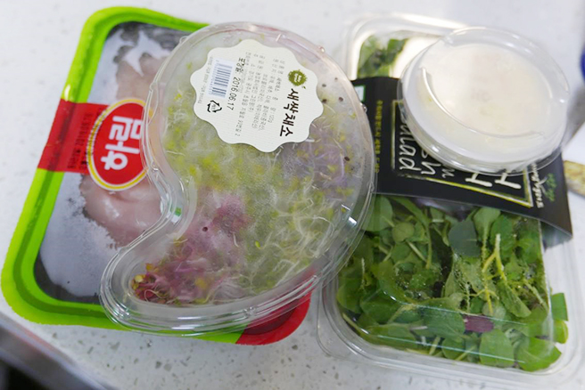 짠! 이렇게 시간 맞춰 집으로 옵니다. 제가 선택한 아이들은? 닭 안심, 새싹채소, 에그 포테이토 샐러드, 그리고 샐러드팩!
