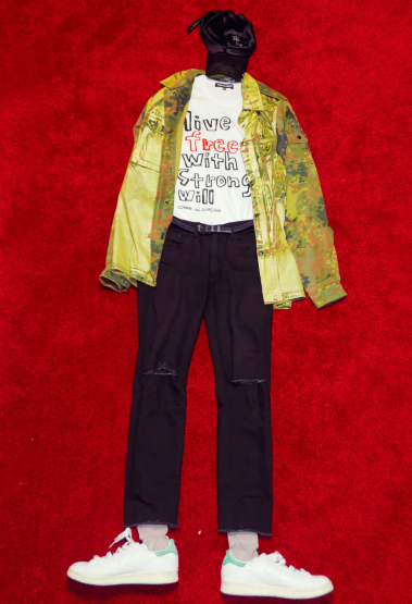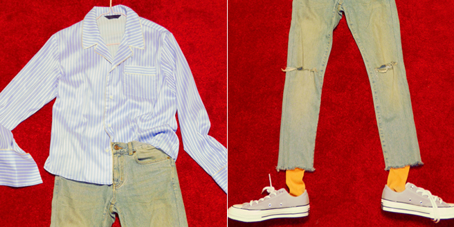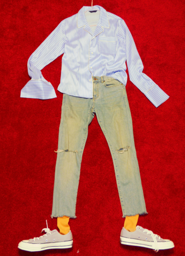 셔츠, 바지, 신발까지 같은 톤으로 매치하고 양말로 포인트를 주었답니다.