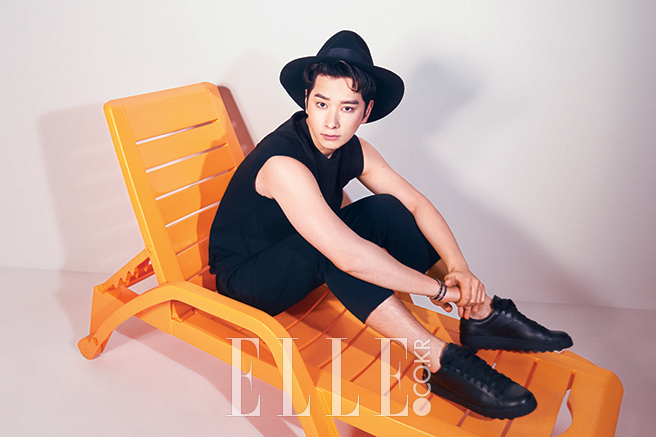 블랙 슬리브리스 톱은 Nohant by Beaker. 팬츠는 System Homme. 블랙 스니커즈는 Coach. 모자는 Kaori. 팔찌는 Speedometer Official.