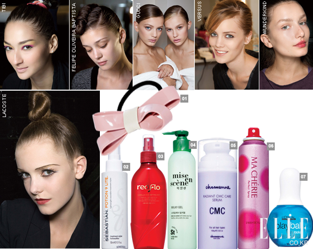 1 리본 헤어 밴드. 프란세스 비. 2 UV 차단과 컬러 보호 효과가 있는 포션 9 라이트 웨어러블 트리트먼트 스타일러. 150ml. 3만원대. 세바스찬. 3 레드플로 동백 헤어 세팅 미스트. 210ml. 8천원대. 소망화장품. 4 영양을 공급하는 스타일케어 밀키젤 내추럴 소프트. 250ml. 6천원대. 미쟝센. 5 큐티클을 강화시키는 래디언트 CMC 케어 세럼. 100g. 3만6천원. 샤멘느. 6 가벼운 홀딩력을 자랑하는 마쉐리 퍼펙트 스프레이. 100g. 1만2천원. 시세이도. 7 포도향 플레이볼 스프레이 퍼지 락스. 150ml. 3만원대. 로레알 프로페셔널 파리.