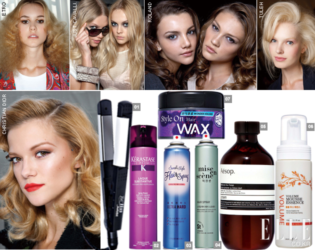 volume up hair 웨이브 스타일은 모발 길이, 컬의 모양과 방향, 볼륨의 크기에 따라 분위기가 180도 달라진다. 한때 무심한 듯 시크한 느낌의 부스스한 웨이브 롱 헤어가 각광받기도 했지만 이번 시즌만큼은 게으르고 지저분하다는 인상을 주기 쉽다. 블루마린과 프라다, 저스트 카발리, 에트로, 스포트막스 등의 쇼에서 잘 정돈된 느낌의 볼류미한 웨이브 스타일을 트렌드로 제시했기 때문이다. 하지만 과장되게 부풀린 아프로 헤어 스타일을 떠올리면 곤란하다. 이번 시즌에 유행하는 볼륨 웨이브 스타일의 키포인트는 바로 내추럴함! 즉 평소 꼼꼼한 헤어 트리트먼트를 통해 윤기가 흐르는 건강한 모발을 유지하는 것이 가장 중요하다. 그런 다음으로 모발 손상을 줄이면서 세팅력이 좋은 각종 스타일링 제품을 활용해 원하는 모양을 만들어주면 된다. 또 머리카락의 모양을 만질 때는 전체에 볼륨을 넣는 것보다 모발의 위나 아래 한쪽에만 선택적으로 볼륨을 더하도록 한다. 가령 머리를 길게 늘어뜨린 스타일에는 모발의 윗부분은 차분하게 붙여주고 아랫부분에 컬을 넣어 볼륨을 주고, 머리 길이가 짧거나 위로 묶어 올리고 싶을 때는 앞머리나 정수리 부분을 부풀리고 끝부분에 가벼운 컬을 넣는 정도로 마무리. 그런 다음 볼륨 부위에 고정력이 강한 스프레이를 가볍게 뿌리면 깔끔한 스타일을 오래 유지할 수 있다.