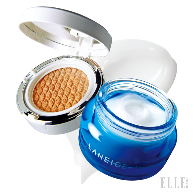 (왼쪽) 3D 입체 형상으로 퍼프에 골고루 묻어난다. 가볍게 스팀을 쐰 듯 맑고 촉촉하게 빛나는 피부를 완성하는 비비쿠션_화이트닝, 3만7천원대(리필 포함). (오른쪽) 탱글탱글 반투명 텍스처가 시원하고 깔끔하게 펴 발려 지금 시즌에 쓰기 제격. 워터뱅크 젤 크림, 3만7천원대, 모두 Laneige.