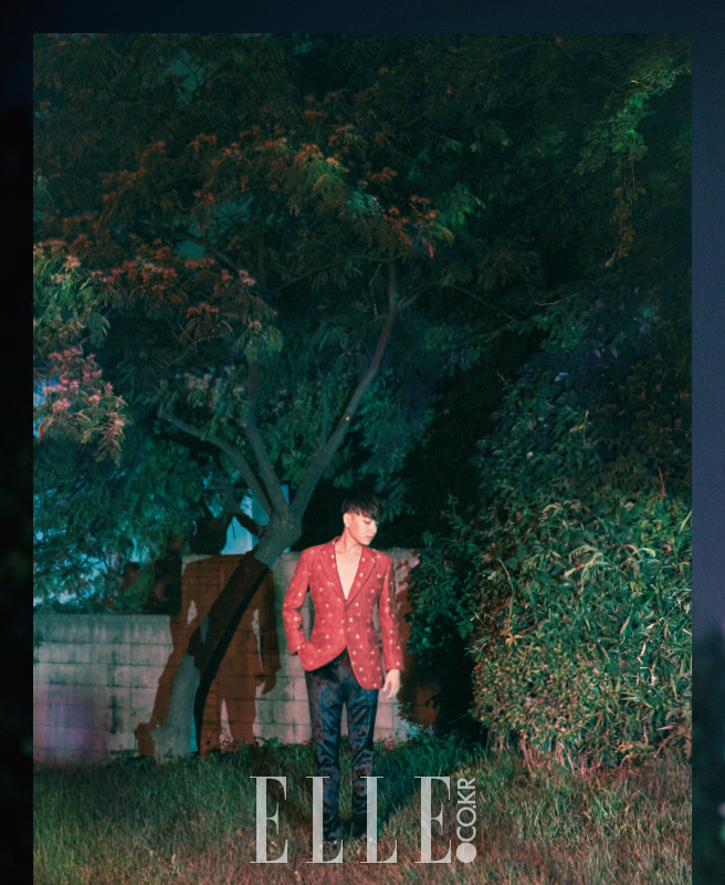 플라워 패턴의 레드 컬러 재킷과 블랙 팬츠는 모두 Kimseoryong.