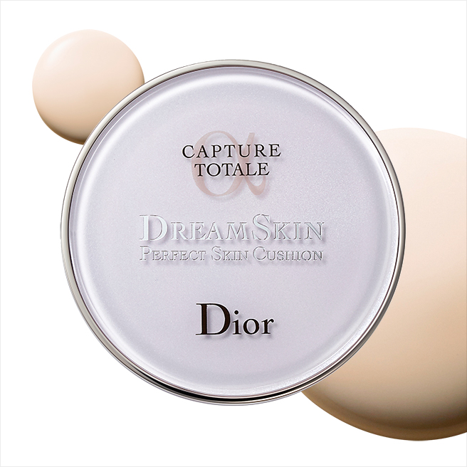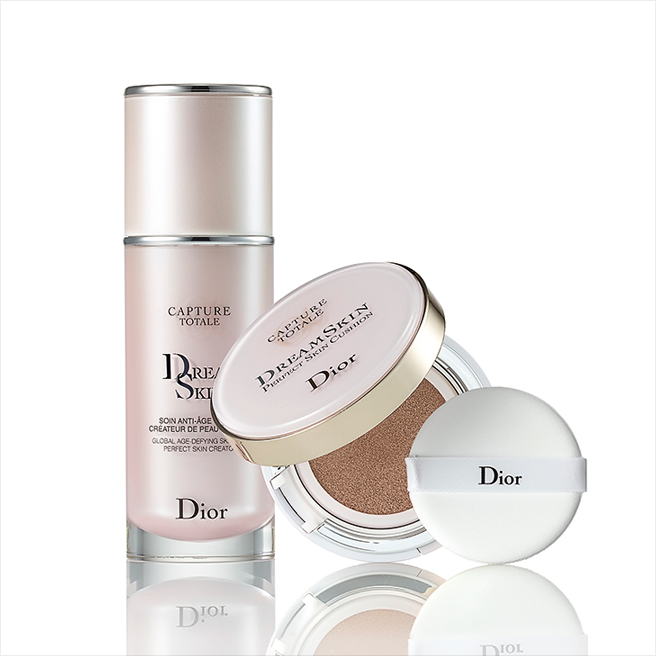 (왼쪽부터) 캡춰 토탈 드림스킨, 50ml 17만5천원. 캡춰 토탈 드림스킨 퍼펙트 스킨 쿠션 SPF50+PA+++, 15g×2 10만원, 모두 디올.