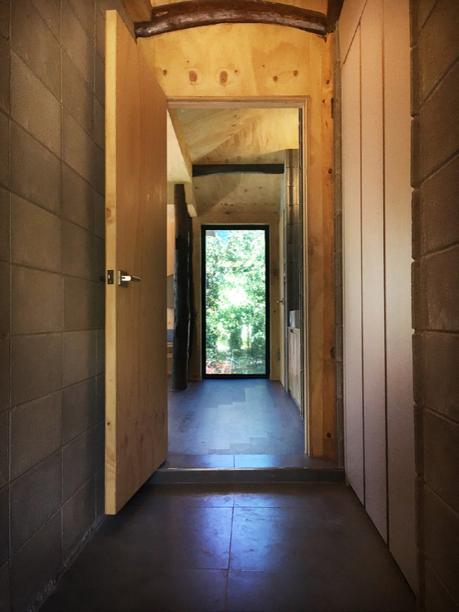 다시 하동집으로 가보자. 처음 이 길이 생기던 날, 즉 조적(벽돌쌓기)을 하는 장면을 보고 그만 압도당하고 말았다. 생각보다 높은 벽. 압도적으로 높은 벽면은 묘한 긴장감을 준다. 사실 이 벽은 기존 부분(흙집)과 확장한 부분(벽돌집)의 경계선이기도 하다. 양 벽면은 회색 블록으로 쌓여있지만, 천정에는 기존의 서까래를 그래도 두어 이 집의 특성(옛집과 새로운 건축의 조화)을 그대로 보여준다.