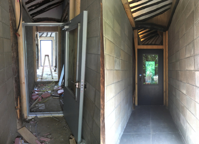 (윗쪽 왼쪽) 조적(벽돌쌓기)공사와 목공사, 창호공사를 마친 모습. 현관문은 유리를 끼운 철제문으로, 중문은 사생활 보호를 위해 나무문으로 정했다.
