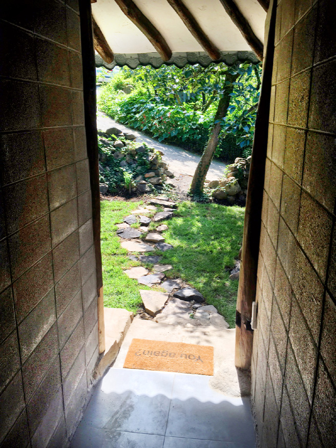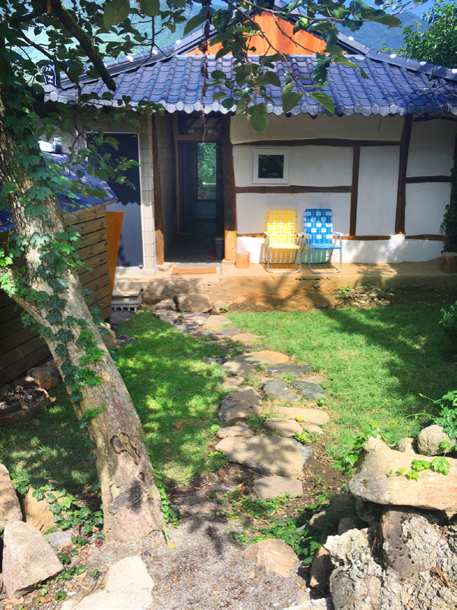 현관에서 바라본 입구 마당의 모습. 구들에서 나온 납작한 돌을 모아 디딤돌로 놓고 잔디를 사다가 직접 심었다.