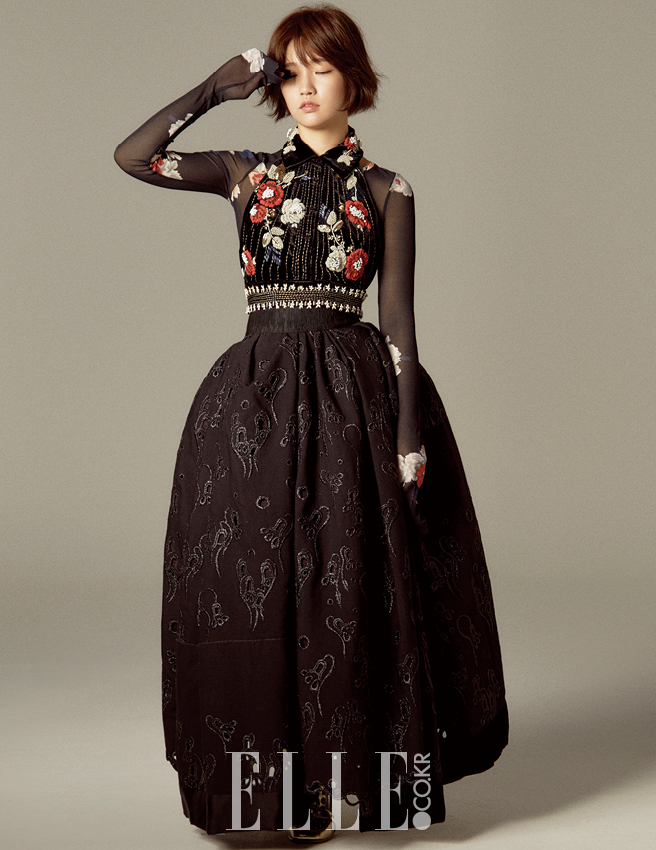 플라워 자수가 놓인 시스루 톱은 Fendi. 안에 입은 슬리브리스 원피스는 Stylenanda.