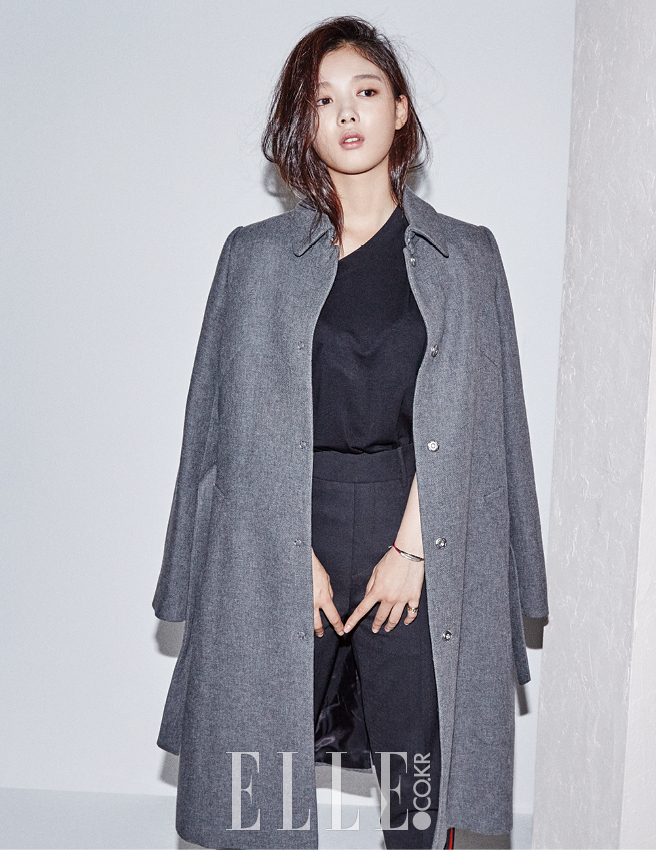 그레이 코트는 Marimekko. 안에 입은 블랙 톱은 Bounce Finger. 팬츠는 Neil Barrett. 브레이슬렛은 Stonehenge. 링은 Mzuu.