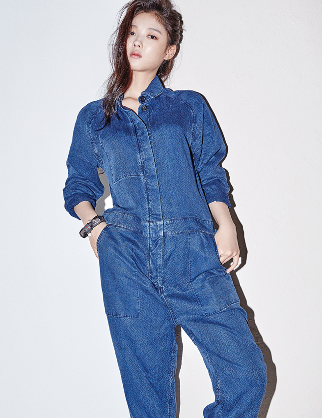 보이시한 핏의 데님 점프수트는 YMC. 팔찌는 Mzuu.