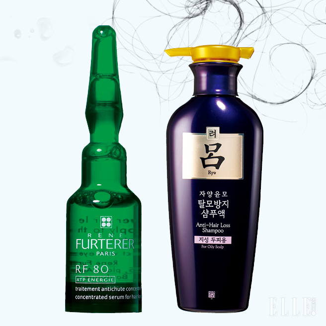 (왼쪽부터)출산과 다이어트, 스트레스로 인한 일시적 탈모 개선에 특화된 앰풀. RF80 ATP, 12개입 7만8천원대, Rene Furterer. 인삼 사포닌 성분이 탈모를 예방해 주는 의약외품 샴푸는 자양윤모 탈모방지 샴푸, 1만6천원대, Ryo.
