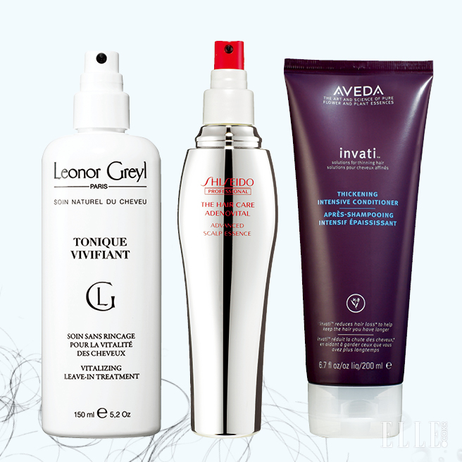 (왼쪽부터) 두피와 모근을 강화하는 스프레이 타입의 토닉은 도니끄 비비휘앙, 6만8천원, Leonor Greyl. 아침저녁으로 하루 두 번 뿌려 발모를 돕는 더 헤어케어 아데노바이탈 어드밴스드 스캘프 에센스, 7만7천원, Shiseido Professional. 콩 단백질 성분이 모발이 두껍게 자라도록 돕는 인바티 씨크닝 인텐시브 컨디셔너, 3만4천원, Aveda.