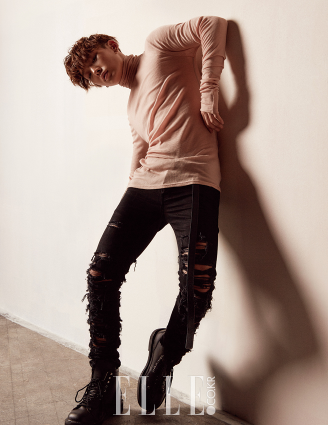 터틀넥 풀오버는 Lanvin Homme. 블랙 컴뱃 부츠는 Yohji Yamamoto. 디스트레스드 진은 스타일리스트 소장품.