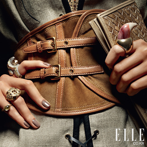 3 스웨이드에 가죽으로 트리밍된 와이드 벨트, 650달러, MIU MIU. 파이톤 레더 클러치백, 445달러, FURLA. 유색 보석과 다이아몬드로 장식된 골드 메달과 화이트 다이아몬드가 세팅된 조형적인 모양의 링, 가격 미정, DE BEERS. 황수정 장식이 독특한 반지, 650달러, MARCO BICEGO . 송곳니 모양의 유색 보석 반지, 495달러, BALENCIGA BY NICOLAS GHESQUIERE. 캔버스 소재 리넨 드레스, 2600달러, CELINE.